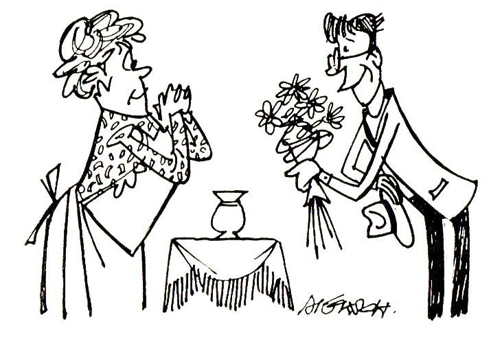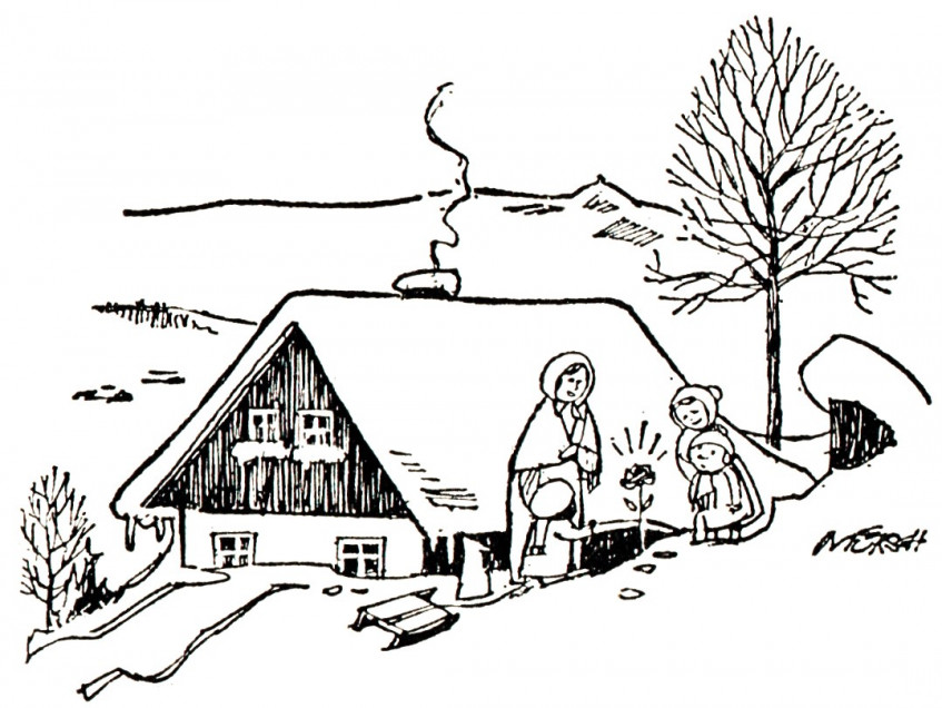 Illustration von Hans Müksch, "De  Chröstruse",  in Rudolf Tamm, Heinz Kleinert: "Nej su wos" Geschichten und Gedichte in Gablonzer Mundart, Gablonzer Archiv und Museum e.V. ,1966.