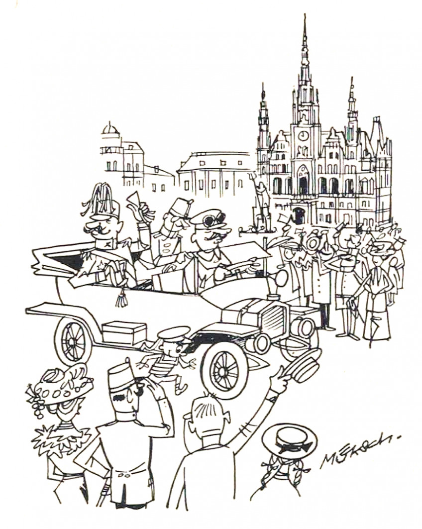 Illustration von Hans Müksch "Dr Kaisr kömmt" in Walther J. Beer: Horcht ock, Nopprn!, Gablonzer Archiv und Museum e.V. ,1961.