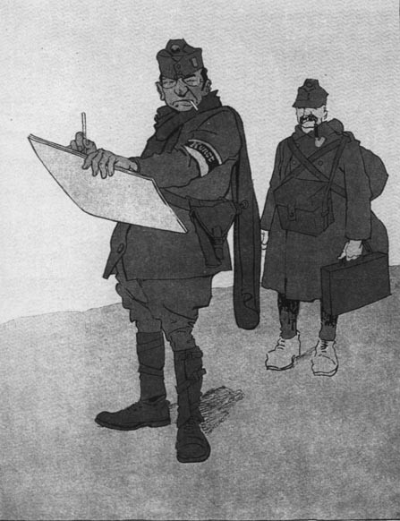 l.: Ausgerechnet mich stellen sie an zum Kopieren von spitzige Drahtverhaue und zackige Felsen, wo ich mein Lebtag nur gemacht habe in runde, weibliche Akte." Karikatur aus „Die Muskete" 1917