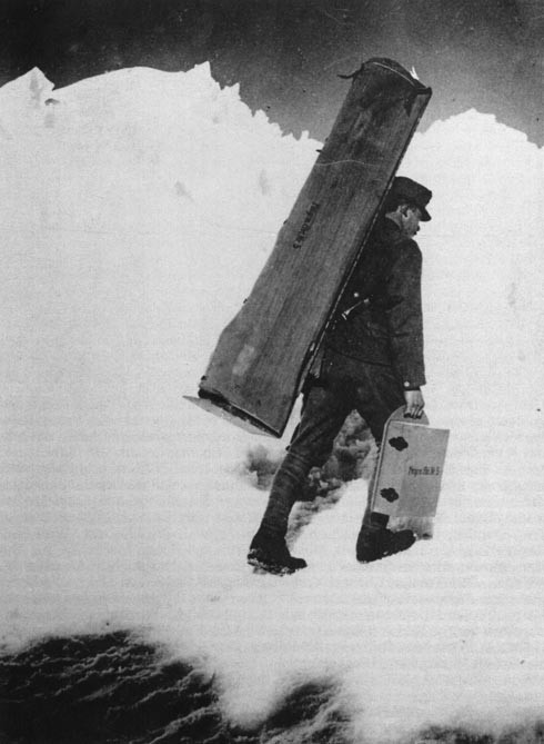 r.:Träger mit Fernkamera beim Aufstieg in eine Hochgebirgsstellung